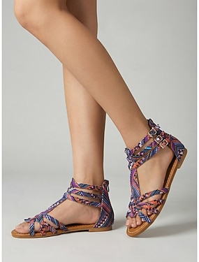 Kleurrijke geweven gladiatorsandalen voor dames - levendige boho platte sandalen met meerdere bandjes voor resortvakanties en zomerfestivals. &tropische reizen