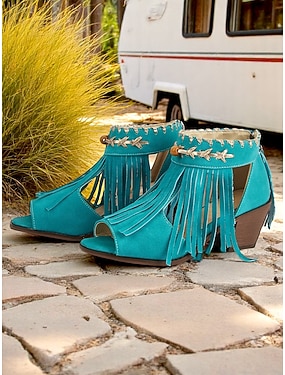 Blauwe bohemia peeptoe sandalen met franjes en blokhakken voor dames – open teen zomerschoenen in westernstijl voor muziekfestivals en casual uitjes