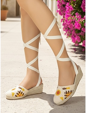 Dames espadrilles met sleehak, geborduurd in bohemian stijl en voorzien van lintveters – tropische eilandstijl, elegante sandalen met bandjes voor luxe cruises en exotische strandvakanties.