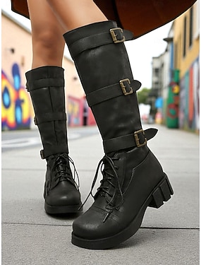 Dames Laarzen Biker laarzen Brede kuitlaarzen Rijlaarzen Buiten Dagelijks Kleurenblok Kniehoge laarzen Blokhak Gepuntte Teen Elegant minimalisme PU Leegloper Zwart Bruin