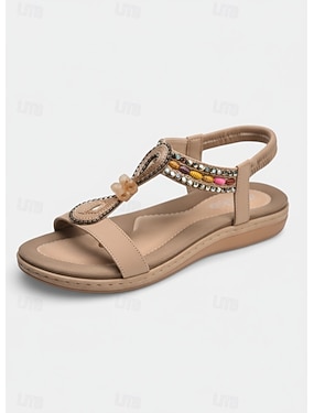 Elegante crèmekleurige damessandalen met T-bandje - comfortabele, bohemian platte schoenen met kristallen versieringen, perfect voor strandvakanties en zomerbruiloften. &buitencruises