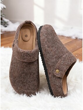 Dames koffiekleurige instapklompen van imitatieviltwol met knoopdetail – comfortabele, warme muiltjes voor binnen en buiten voor casual wandelingen en thuisgebruik