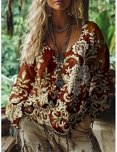 Dames Overhemd Boho-shirt Blouse Afdrukken Bloemig Grafisch Bohemen Stijlvol Klassiek Lange mouw V-hals Normale tops Dagelijks Feestdagen Uitgaan Wijn Lente Herfst
