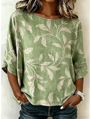 Dames Blouse Linnenachtig Ademend Lichtgewicht Lange Mouw V-Hals Bloem Vintage Tropisch Hawaïaans 3/4 Lengte Mouw Crew Neck Dagelijks Vakantie Strandoutfit Print Wit Roze Koningsblauw Paars Groen