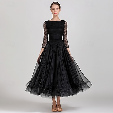 Elegante zwarte ballroom dans oefenjurk voor dames met kanten mouwen en boothals, wals tango, moderne rumba trainingsjurk