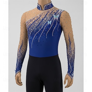 Kunstschaatstopje Voor heren Schaatsen Tops Blauw Lapwerk Rekbaar Opleiding Wedstrijd Kunstschaatskleding Klassiek Kristal / Bergkristal Lange mouw Schaatsen Kunstschaatsen