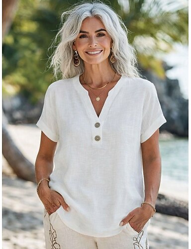 Dames Blouse Knop Effen Kleur Stijlvol Casual Korte mouw V-hals Normale tops Dagelijks blauw Zwart Wit Rood Abrikoos Zomer Lente
