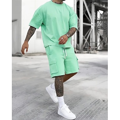 Voor heren Trainingsset Trainingspak T-shirt en korte broek Set Kledingset Strakke ronde hals Buiten Dagelijks Sport Zak Trekkoord 2-stuks Effen Zwart Rood Groen Polyester Sportkleding Klassiek Casual