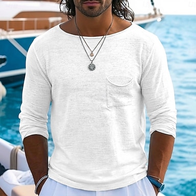 Voor heren Linnen T-shirt Lange mouw Boothals Zomer Lente Alle seizoenen Effen Kleur Vintage Bohémien Casual Puur Casual Vakantie Straat blauw Zwart Wit Top T-shirt voor mannen