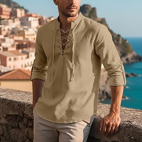 Voor heren Overhemd Linnen overhemd Viking-stijl Zomer overhemd Strand Kleding Overhemd met bandkraag Effen Kleur Casual Vakantie Zwart Wit Groen Khaki Lange mouw Overhemdkraag Zomer Lente Kleding