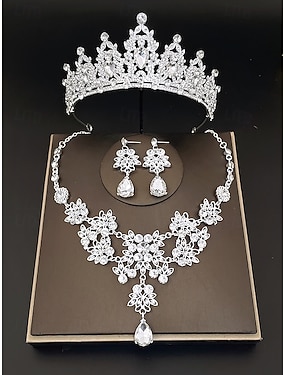 Zilveren tiara met strass steentjes en sieradenset voor dames – elegante ketting, oorbellen en kroon voor bruiloften, optochten en speciale gelegenheden