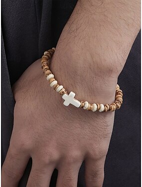 Herenarmband van natuurlijk hout met turquoise kruis – handgemaakte bohemian stretch polsband voor casual kleding, zomeroutfits en strandvibes
