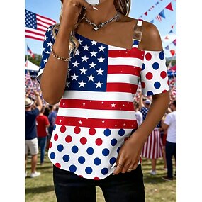Amerikaanse onafhankelijkheidsdag Dames T-shirt Afdrukken Grafisch Amerikaanse vlag Modieus Stijlvol Klassiek Korte mouw Eén-schouder Normale tops Dagelijks Uitgaan Weekend Rood Zomer Lente