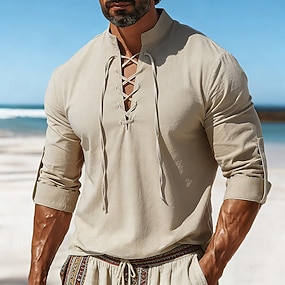Voor heren Overhemd Viking-stijl Zomer overhemd Strand Kleding Piraten shirt Effen Kleur Casual Vakantie Wit Marineblauw Hemelsblauw Groen Lange mouw Opstaand Zomer Lente Kleding Trekkoord
