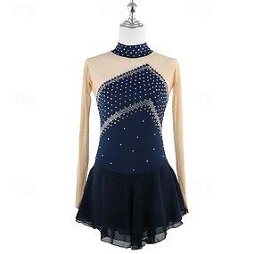 Kunstschaatsjurk Dames Voor meisjes Schaatsen Jurken Donker Marineblauw Lapwerk Duimopening Netstof Spandex Rekbaar Opleiding Oefenen Professioneel Kunstschaatskleding Thermisch Warm Kristal