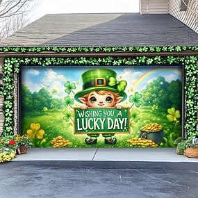 St. Patrick's Day garagedeurdecoratie, schattige kabouter die geluk wenst, regenboog &Klavertjes op de achtergrond, feestelijke buitendecoratie voor de viering van St. Patrick's Day.