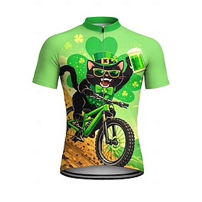 Heren St Patrick Jersey Fietsshirt Downhill Jersey Kat Vierbladige Klaver Oktoberfest Bier Korte Mouwen Fiets T-shirt Top met 3 Achterzakken UV-bestendig Sneldrogend Met Zakken Voorkant Rits Sport