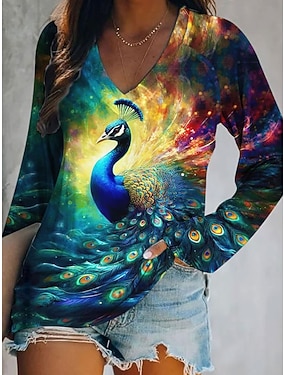 Dames T-shirt Afdrukken Ombre Grafisch Veer Elegant Bohemen Vintage Lange mouw V-hals Normale tops Dagelijks Uitgaan Weekend blauw Geel Blozend Roze Lente Herfst