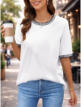 Dames T-shirt Lapwerk Gestreept Modieus Stijlvol Klassiek Korte mouw Strakke ronde hals Normale tops Dagelijks Uitgaan Weekend blauw Zwart Wit Blozend Roze Paars Zomer Lente