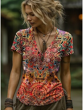 Dames T-shirt Afdrukken Bloemig Grafisch Paisley Bohemen Vintage Stijlvol Korte mouw V-hals Normale tops Dagelijks Uitgaan Weekend blauw Zwart Blozend Roze Rood Oranje Zomer Lente