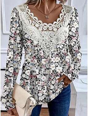 Dames T-Shirt Kant Splicing Top Bloem Stijlvol Etnisch Casual Lange Mouw V-Hals Reguliere Tops Dagelijkse Kant Patchwork Print Zwart Geel Roze Blauw Zomer Lente