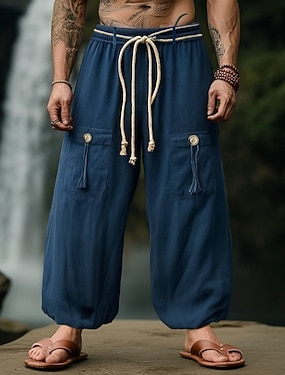 Voor heren Linnen broek Broek Zomerbroek Harembroek Zak Trekkoord Elastische taille Effen Comfort Ademend Enkellengte Huis Casual Dagelijks Modieus Klassieke Stijl Zwart Marineblauw