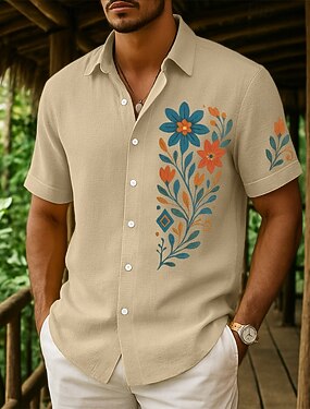 Voor heren Overhemd Linnen overhemd Zomer overhemd Strand Kleding Overhemd met knopen Flora Vakantie Curise Geel Blozend Roze Marineblauw Groen Korte mouw Kraag Zomer Lente zomer Kleding