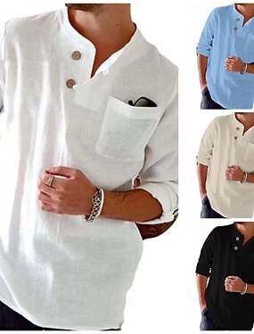 Voor heren Katoenen linnen overhemd Effen Vakantie Zwart Wit Khaki Donkergrijs Lange mouw opa kraag Kleding Zak