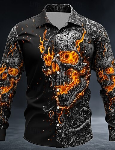 Voor heren Doodskoppen Bloemenprint Vlam Overhemd Overhemd met knopen Lange mouw Donkere punkgotiek Buiten Feestdagen Zomer Lente Strijkijzer 3D-afdrukken shirts met kraag Zwart 1 Zwart