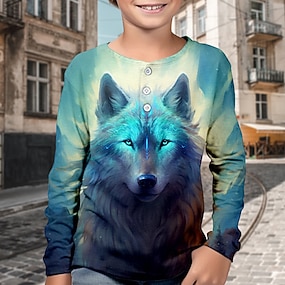 Jongens 3D Wolf Henley-shirt Lange mouw 3D-afdrukken Herfst Winter Sport Modieus Streetwear Kinderen 3-12 jaar Strakke ronde hals Buiten Casual Dagelijks Normale pasvorm
