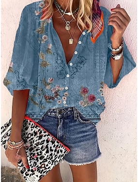 Dames Overhemd Afdrukken Ombre Bloemig Grafisch Bohemen Vintage Dagelijks 3/4 mouw V-hals Normale tops Dagelijks Feestdagen Strand Kleding blauw Grasgroen Blozend Roze Marine Blauw Paars Zomer Lente