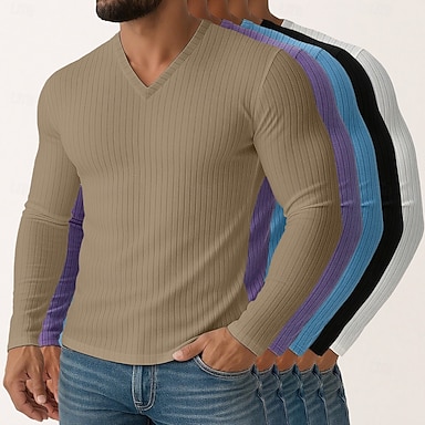 Voor heren T-shirt Geribbeld gebreid T-shirt Shirt met lange mouwen Lange mouw V-hals Lente Herfst Winter Effen Verticale stroken Pitstrook Modieus Ontwerper Basic 5-delig Multipack Vakantie Straat