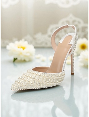 Bruidsschoenen met parelversiering – elegante witte slingback trouwschoenen – stilettohakken met spitse neus