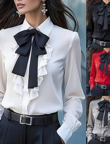 Dames Overhemd Blouse Ruche Strik Effen Kleur Elegant Stijlvol Basic Lange mouw Strijkijzer Normale tops Dagelijks Kantoor Werk Zwart Wit Rood Grijs Lente Herfst Winter