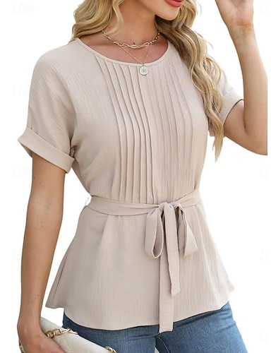 Dames Blouse Imitatie katoenlinnen Strik Effen Kleur Dagelijks Stijlvol Basic Halve mouw V-hals Normale tops Dagelijks blauw Wit Geel Blozend Roze Rood Zomer Lente Herfst