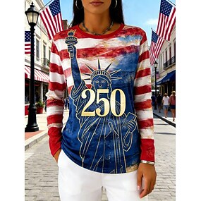 Amerikaanse onafhankelijkheidsdag Dames T-shirt Afdrukken Grafisch Gestreept Modieus Stijlvol Basic Lange mouw Strakke ronde hals Normale tops Dagelijks Uitgaan Weekend blauw Zomer Lente Herfst 250th