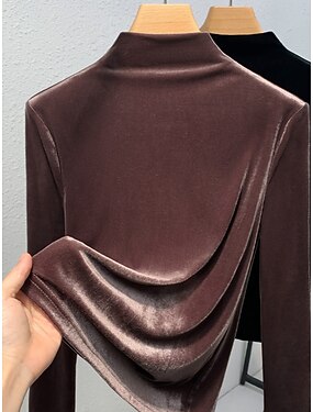 Vrouwen Fluwelen Blouse Effen Kleur Elegante Stijlvolle Basis Lange Mouw Hoge Hals Regular Tops Dagelijks Gerimpeld Zwart Wijn Paars Bruin Lente Herfst Winter