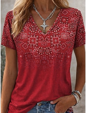 Dames T-shirt Afdrukken Bloemig Grafisch Planten Bohemen Vintage Stijlvol Korte mouw V-hals Normale tops Dagelijks blauw Geel Blozend Roze Paars Groen Zomer Lente