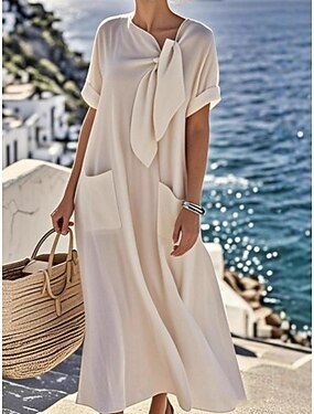 Dames Midi Jurk Zomerjurk Casual Dagelijks Vakantie Strand Regular Fit Linnenachtige Effen Korte Mouwen V-Hals Wit Roze Blauw Groen Zomer