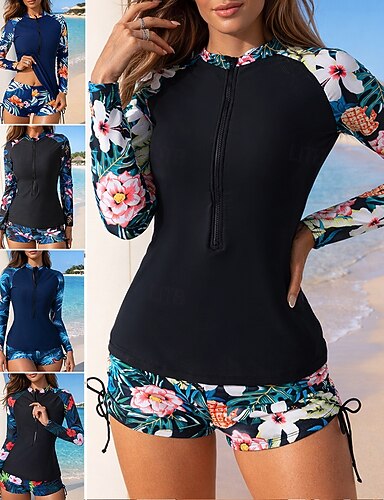 Dames Normaal Rashguard-badpak Uitslagbescherming Zwempak met bloemenprint Flora Tropisch Kleurblokkering 2-stuks Verwijderbare vulling boyleg UV-zonbescherming UPF50+ Elastisch Lange mouw