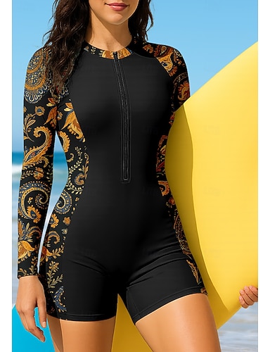 Dames Uitslagbescherming Badpak Boyleg Bloemig Paisley Rits omhoog Verwijderbare vulling Rits Aan De Voorzijde UV-zonbescherming UPF50+ Ultralicht (UL) Lange mouw Zwemkleding Uitslagbescherming