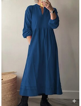 Dames 100% Katoenen Maxi Jurk Faux Linnen Shift Jurk A-lijn Jurk Fit En Flare Jurk Vakantie Casual Boho Dagelijks Feest Losse Pasvorm Eenvoudig Lange Mouw V-hals Blauw Zwart Rood Zomer Lente Fall