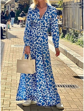 dames bloemen overhemdkraag maxi jurk lange mouw zomer lente