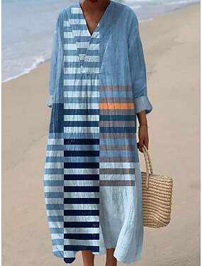 Dames Midi Jurk V Hals Lange Mouwen Kaftan Lichtgewicht Losse Pasvorm A Lijn Jurk Casual Boho Feest Uitgaan Losse Pasvorm Grafiek Geometrisch Streep Lange Mouwen V Hals Zwart Geel Blauw Oranje