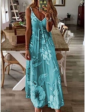 Dames Maxi-jurk Zonnejurk strand jurk Slipdress Modieus Basic Modern Dagelijks Buiten Strand Ruim Passend Bloemig Mouwloos V-hals blauw Zomer Lente