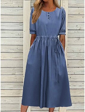 Dames midi-jurk van imitatie katoen en linnen, shiftjurk, zomerjurk, casual, dagelijks, losse pasvorm, effen, korte mouwen, ronde hals, blauw, fuchsia, groen, donkerblauw, zomer, lente