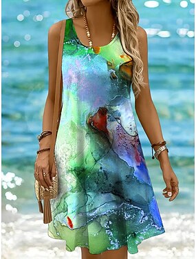 Dames Mini-jurk Casual jurk Zonnejurk A lijn jurk Off-the-shoulder jurk Vakantie Casual Normale pasvorm Grafisch Abstract Marmeren afdrukken Mouwloos U-hals Ronde hals Geel Blozend Roze blauw Paars