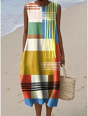 Dames Midi Jurk Linnenachtig Zomerjurk Shift Jurk Vakantie Casual Strand Strand Uitgaan Regular Fit Grafisch Geometrisch Mouwloos Crewneck Blauw Geel Rood Zomer Lente