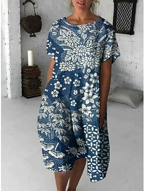 Dames Halflange jurk Casual jurk Zomerjurk Modieus Modern Dagelijks Strand Weekend Normale pasvorm Bloem Korte mouw Strakke ronde hals blauw Wit Zomer Lente