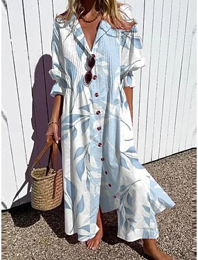 Dames Maxi-jurk Hemdjurk Casual Dagelijks Ruim Passend Effen 3/4 mouw Col blauw Zomer Lente Herfst
